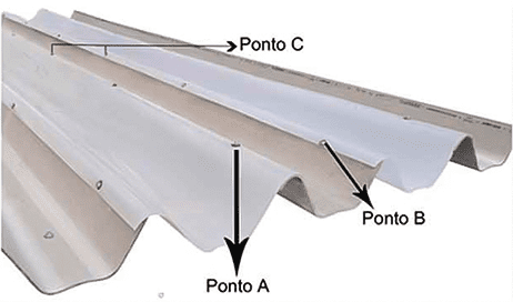 Na fixação lateral (Ponto C) e na parte frontal onde encontra a onda da telha calheta de polipropileno x terminal da telha calheta de fibrocimento (ponto B), usar parafuso auto brocante zincado com arruela de vedação com diâmetro de 8 x 75mm a cada 60cm. Na parte frontal onde se encontra a telha calheta de polipropileno com a telha calheta de fibrocimento (ponto A) usar parafuso fixador com arruela de vedação com diâmetro de 8 x 230mm fixado na estrutura.